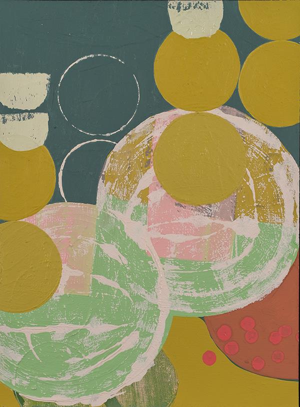 Distinct processes--some spontaneous and quick, others meditative and slow-complement one another and result in a varied body of work. Color is key to her work and her means of entering each piece. Movement and connection is found through the painting process and between pieces. The paintings and monotype collages use quilt-like modular arrangement and compositional space as the common thread between processes.