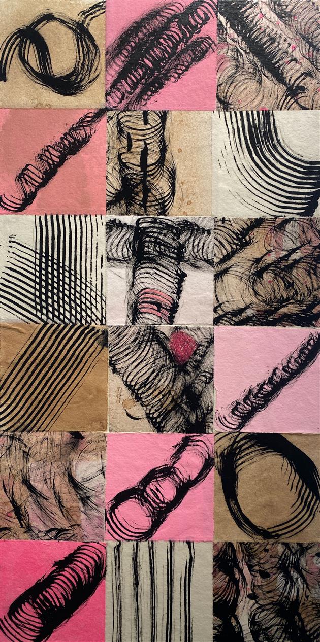 Cathy Sarkowsky’s ink paintings explore the tension between control and abandon in the artistic process. Creating balance between exacting line-work and the unpredictable flow of ink demands surrendering to intuition and spontaneity, letting go of expectations and planned outcomes. The pas de deux of resolutely manipulating materials and letting them evolve results in natural, happy “accidents”.
